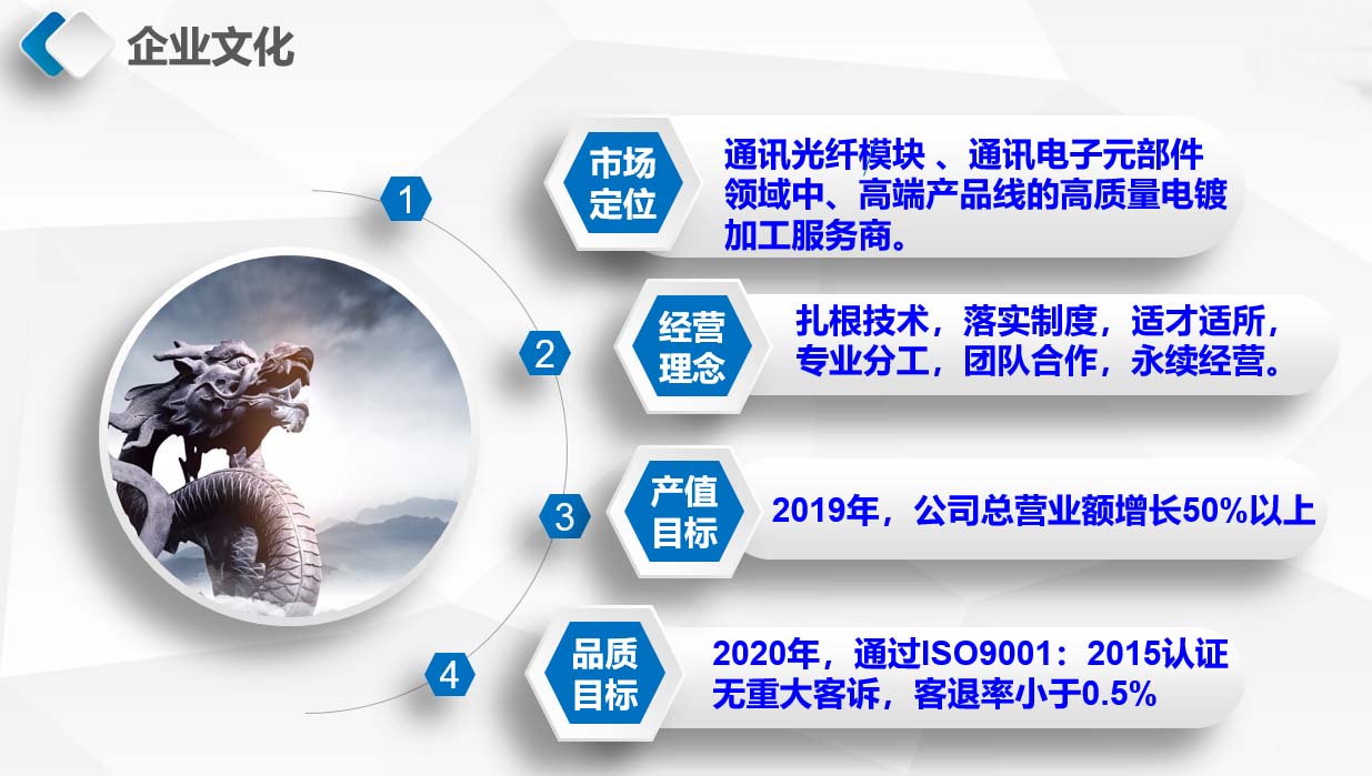 公司專業承接電子類、通訊、光纖、航空等類精密五金接插件、導電接觸片類,對導電性、焊錫性、抗蝕性等有要求的行業。高端產品加工電鍍業務,致力打造成為光通訊領域中、高端產品線的高質量電鍍加工服務商。